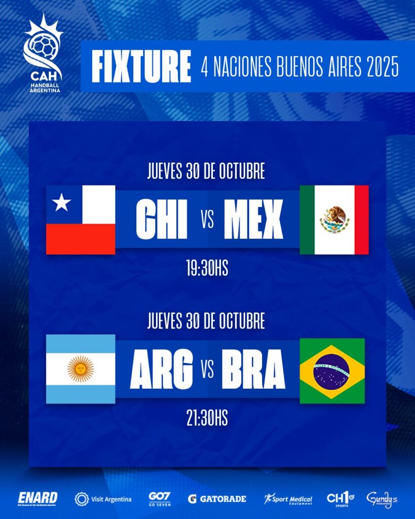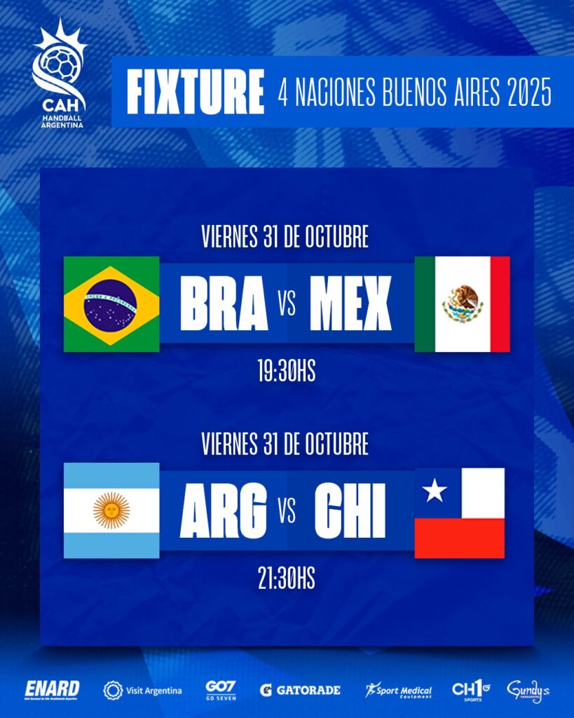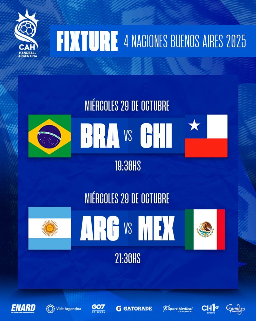 Confirmado el cronograma de partidos para el torneo internacional que se disputará del 29 de octubre al 1 de noviembre en La Casa del Handball. Los Gladiadores debutarán ante México, luego enfrentarán a Brasil y Chile.