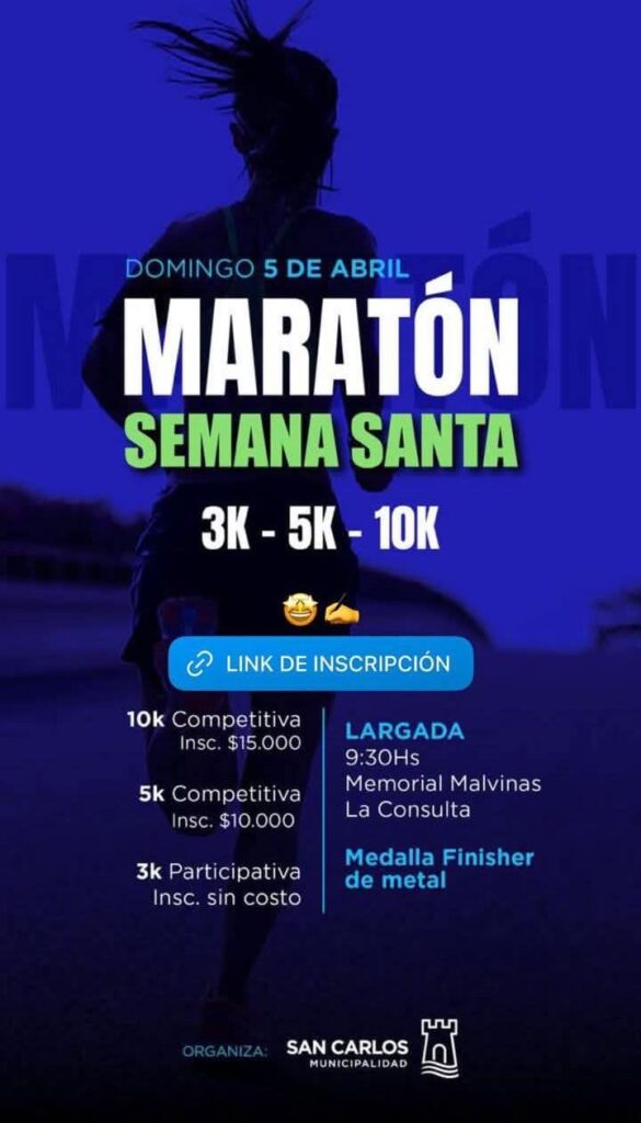 La carrera dará inicio el domingo 5 de abril a las 9:30 horas desde el Memorial Malvinas, en La Consulta. Como reconocimiento, todos los participantes que logren completar el recorrido recibirán una medalla finisher de metal.